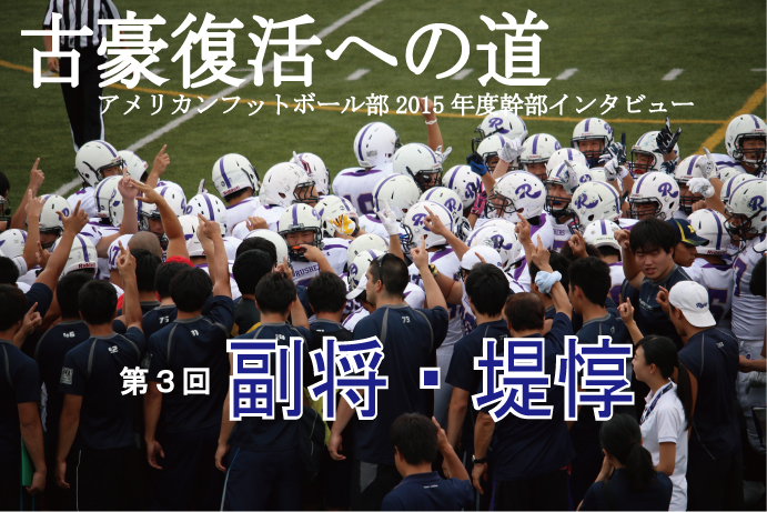 主将副将を決定するとき、幹部になってもいいと覚悟はしていました。私は杉山の支えがあってずっと4年間続けているので、彼を支えたいとその時言いました。私が部に入るきっかけは杉山の言葉です。1年生の時の部の目標が1部5勝2敗、日本一を狙えるポジションにいながら目標の中に負けが含まれている。この部活正直どうなんだろう……と思っていた時に杉山が「一緒に日本一を目指さないか」と言ってくれたんですよ。その言葉があって俺は何かできる、大きなことを成し遂げられるんではないかと思い。ここまでケガとかいろいろあったんですが、彼の言葉があるから自分はここにいられるのかなと思います。 アメフトとの出会い 大学に入った時体育会に入りたいと思っていました。元々は合気道をやっていたのですが、何をしようかと考えていて。アメフトはかっこいいなとは思っていましたが、私顔老けているじゃないですか。新歓期間全然声かけられなくて。声をかけてくれたのがアメフトとヨットで。悩んでいた時に先ほどの杉山の言葉がありました。ここに入れば今までの自分と変われるんじゃないかなと思い入りました。まだ一人前になれていない、変わっている最中ですが、成長はできているのかなと思います。 視野を広く持つ 杉山だけではチームや周りを見きれないこともあるので、そういうところを補てんしていければなと。杉山や春木、山田はプレーで見せるタイプの人間なので、どちらかというと彼らが前を向いて突っ走ってやってほしいので自分の仕事はそれを補う形かなと。副将だと下級生や周りに見られるので、誰よりもハードにトレーニングや練習、リハビリなど。見本になれる振る舞いを心がけています。 セルフスイッチ・セルフスタート ラッシャーズは昔からプレーやメンタルにすごく波のあるチームで。勢いに乗っているときはすごくアグレッシブに競技を楽しんでいい流れなんですけど、その流れが止まると落ちてしまって全然戻ってこられない。そのまま負けてしまうのがパターンで。みんながセルフスイッチ・セルフスタートで誰かに言われなくても自分からやるチームを作りたいです。自分自身ではフィールドに入ったら誰よりも熱く。OLなんでボールは持てないんですけど、ブロックとハードヒットで見せていきたいです。体はでかいですが視野は広い方なんで。幹部でバランスをとってやっていけたらなと思います。春はチームをつくって秋につなげる。試合の結果はこだわるんですけど成長していく姿やフットボールを楽しんでる姿を見せられたら。その中で毎試合毎試合成長を見せ夏に仕上げて秋につなげられたらいいのかなと思います。ポジションの中では、3年生ながらパートリーダーを務めている渡邉(社3)やその後輩たちには期待しています!