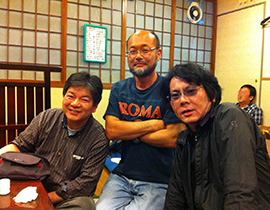 人間と動物の関係性についてこれまで以上に考察を深めるのが私の願望です。私の研究野心は、イタロ・カルヴィーノの言葉を借りるならば、ミリ秒単位の人間の認識の過程を観察しつつ、そのデータの考察には「これからの千年期を見据えた人類学の未来」について考えるべきだと考えます。20世紀の先人(Great predecessors of cultural anthropology)を引き継いで、人類学に元気を取り戻すには、千畳敷の夢を語りましょう。四畳半ではいけませんよ。私の研究サイトにも是非お寄りください。(写真は著名なロボット研究者[右]とこれまた著名な認知症ケア実践研究者[左]との居酒屋でのスナップショットです)
