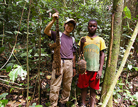 これまで、中部アフリカ3ヶ国(カメルーン、コンゴ・ブラザビル、ガボン)に跨がって森棲みの生活をするバンツー系農耕民バクウェレと、隣接居住する狩猟採集民バカを研究対象に人類学的研究を行ってきました。これらの地域では年々自然保護活動が盛んになっていますが、バクウェレは、成人儀礼に大型類人猿ゴリラの儀礼狩猟を取り込んできた伝統があり、またバカにとっては、ゾウ狩猟は精霊儀礼ジェンギの継承に関わる重要なものです。本プロジェクトでは、生存か商業かという対立的な見方を越えて、動物殺をめぐる表象過程を検討するために、儀礼狩猟や儀礼漁労に焦点を当てた民族誌的記述を行いたいと考えています。