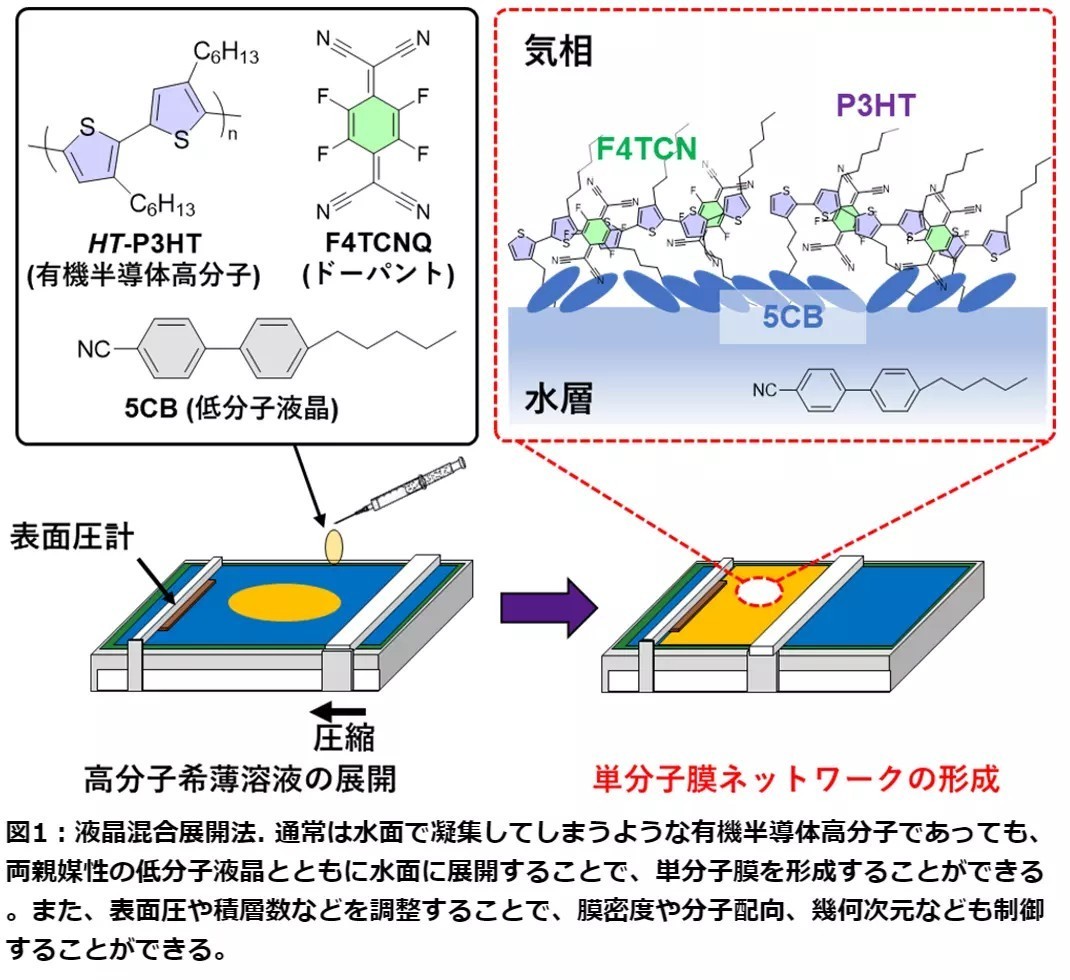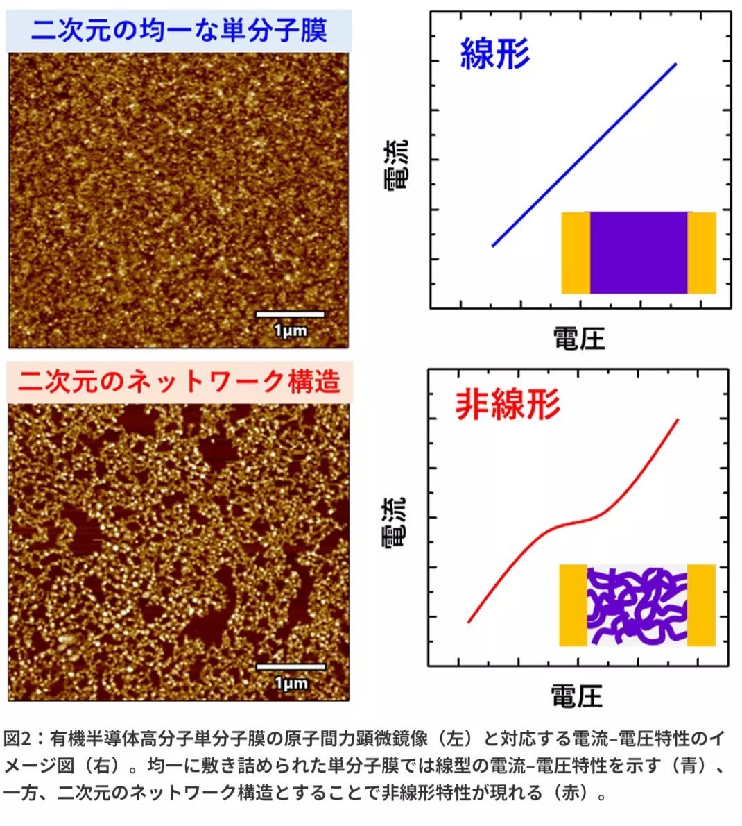 当研究グループは、水面を利用した独自技術である液晶混合展開法を用いることで、ごく一般的な有機半導体高分子の単分子膜形成やそのナノ構造(配向や膜厚など)を自在に制御できることを報告してきました。本研究では、この液晶混合展開法を応用することで、脳の神経ネットワーク構造を模倣した有機半導体高分子の単分子膜ネットワークの作製を試み、そのネットワーク構造と電気特性との相関を詳細に検討しました(図1)。その結果、有機半導体高分子(立体規則性ポリ(3-ヘキシルチオフェン))とドープ剤(F4TCNQ)からなる単分子膜ネットワーク構造を作製し、その二次元膜密度やドープ割合、膜厚、分子配向といったナノ構造を精密に制御できることを示しました。また、そのナノ構造と電気特性との相関を系統的に調査した結果、二次元的に広がったネットワーク構造を示す単分子膜においてのみ非線形の電気伝導特性が見られ、二次元に制限されているネットワーク型の伝導経路が非線形の電気特性を発現するための重要な因子であることを初めて明らかにしました (図2)。さらに、調製した導電性高分子の単分子膜ネットワークは、非線形性や高次性、短期記憶といったマテリアルリザバー素子に必要とされる三つの特性を示すことも明らかにしています。室温にて、加湿など必要なく、動作する特性を持ち、ニューロモルフィックマテリアルとして期待できます。